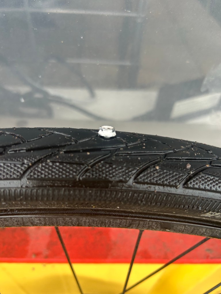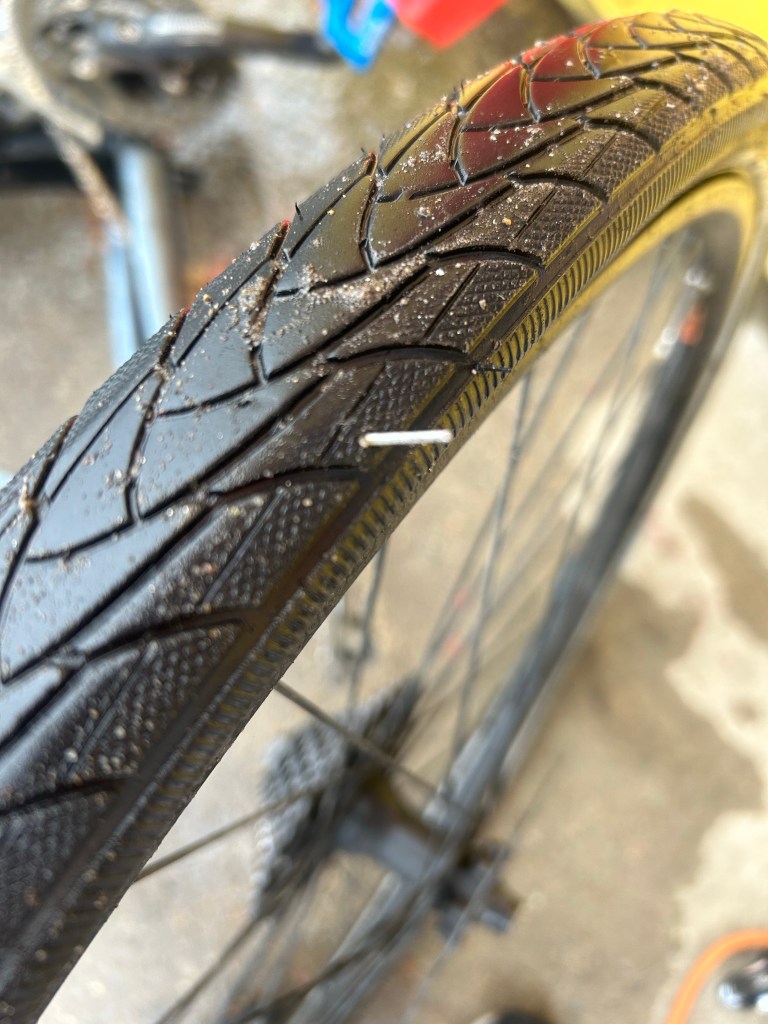 My route would take me south through Smyrna and Murfreesboro and then over to Tullahoma, where I planned to stop for the day. I meandered through the suburbs of Nashville and over through Smyrna – the traffic was pretty light and I was careful because of the wet conditions. As I rode down the highway towards Murfreesboro with a light rain on my shoulders, but enjoying a little tailwind……I got that funny feeling that something wasn’t right. My rear tire was flat. Fixing a flat is never fun, especially on the side of a highway in the rain. There was a used car place right off the road, so I walked my bike over there and asked them if I could work on my bike under their awning. I got permission and found the problem – or I should say problems. I had gotten a double flat! A roofing screw right through the middle of my tire and a nail to the side – what are the odds?