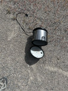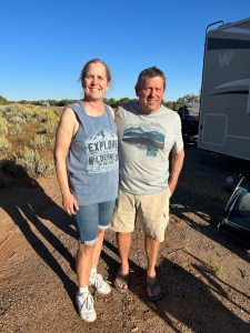 Rejuvenated, I carried on…..but by 5:30 or so I was back to warm water. This time I spotted a motor home parked off the road with a fun-looking vintage dune buggy in tow. “Hello” I called as I pulled up “any chance you have some ice water to spare?” It was my lucky day again as John and Dawn had a freezer full of ice! Not only did they fill up my bottle, but they sat me down in a lawn chair and handed me a bowl of chips to munch on as we talked. John and Dawn are from Cave Creek, AZ, just north of Phoenix. We had a nice chat about traveling and about life…and then I figured I had better get going as it was getting harder and harder to get up out of that chair. We said our goodbyes and I pedaled off down the road. Another chance meeting with awesome people!