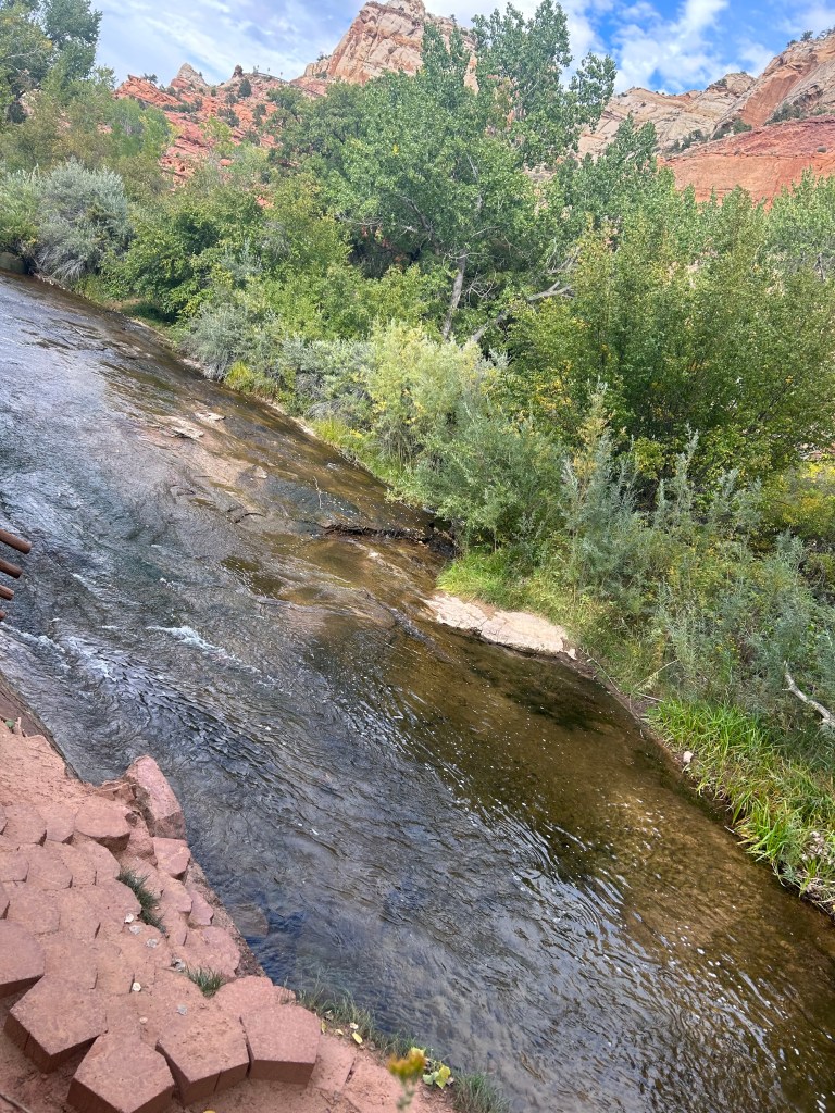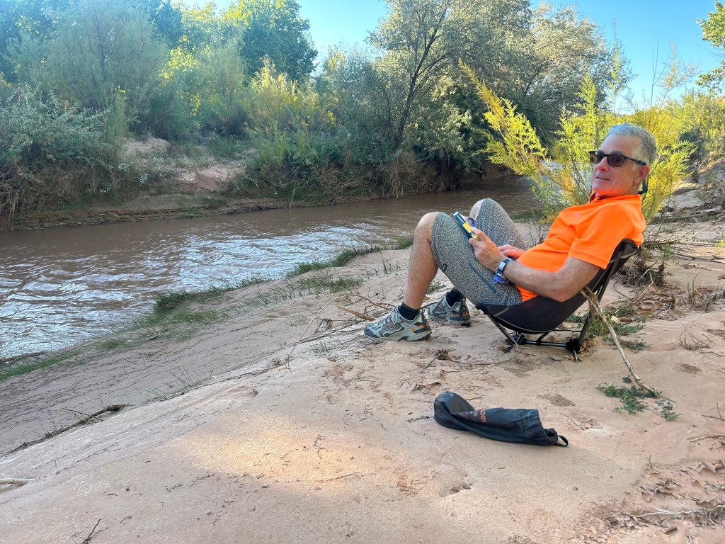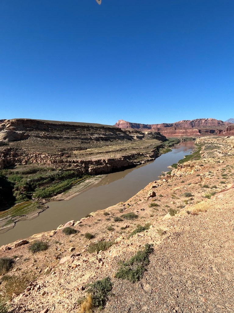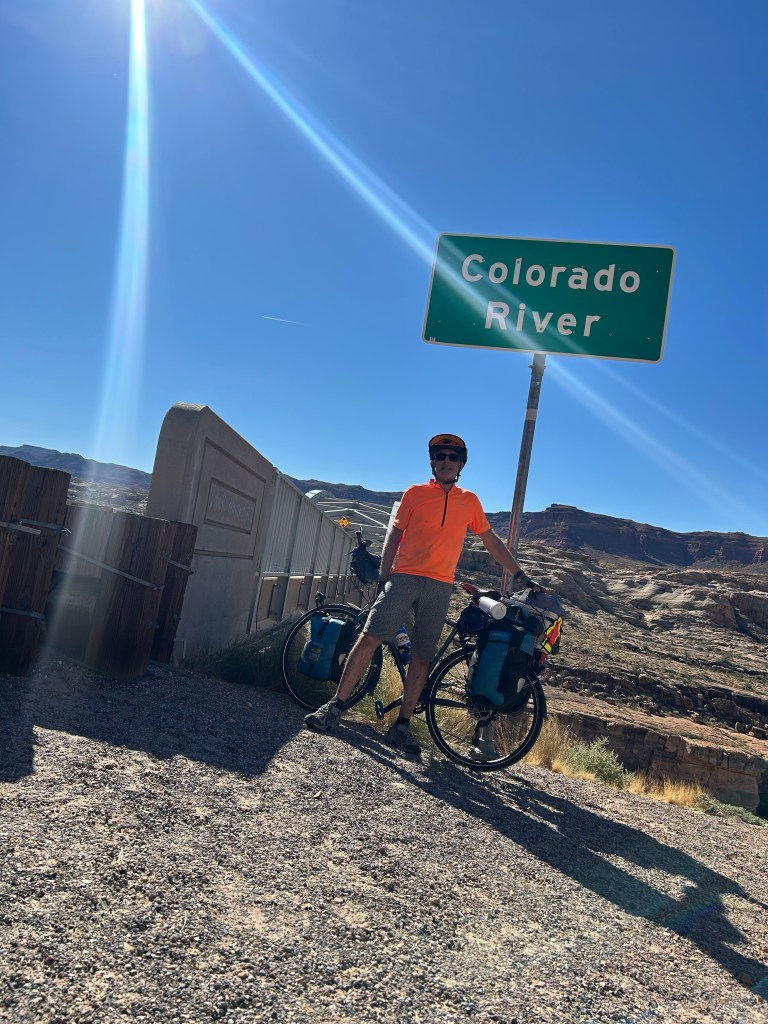 As I was leaving, the couple from Canada pulled up as they were doing a hike from the picnic area – and they graciously offered to fill my water bottles. It turned into a hot day, but I did have a bit of a tailwind for most of the morning. The scenery was incredible and I also crossed the Colorado River – which at that point reminded me of the Rio Grande when it is low – muddy and not too impressive.