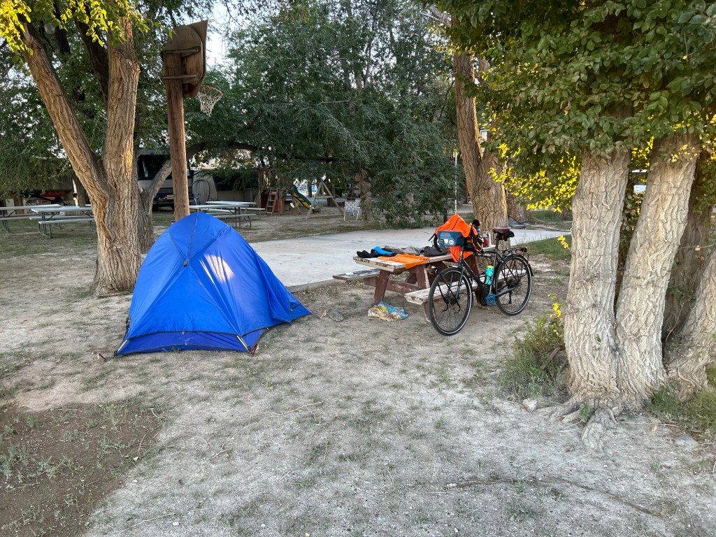 I walked in and was the only one in the place except for the bartender and the cook. They looked at me, I looked at them – and then I said “ I heard that you let through cyclists camp here.” “We sure do”, said the bartender, “ you can set up anywhere behind the building, want a beer?” “Let me set up camp first”, I replied and headed around back. There were a bunch of trailers in the back, I guess for the staff, and a kind of weedy courtyard with a small basketball court and a couple of picnic tables. Nearby a big generator was humming away. Well, I was here, so I picked a flat spot and put up my tent.