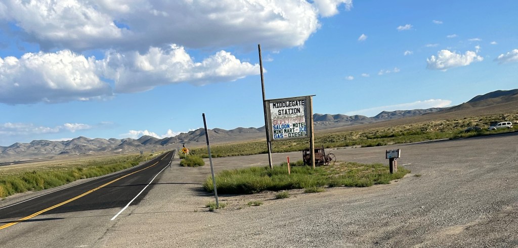 I was up early, broke camp, and got on the road. There wasn’t much going on in Silver Springs other than the two ratty looking casinos and a gas station….but there was a little coffee shop that had just opened and some very chipper baristas made me a coffee and a sandwich. My goal for today was to make it to Middlegate, this kind of mythical place that had been mentioned to me by a few people including my host in South Lake Tahoe, Dan. Evidently there were good burgers, a free place to camp, and a gathering place for people traveling through the middle of nowhere. How could you not want to go there? It was a 70 mile ride, so my plan was to stop in Fallon for lunch, a few groceries and water. While I was eating lunch two more people asked if I was going to stop at Middlegate – now I really had to go! I was motivated and got back on the road and started pedaling hard. And then I saw him – another touring cyclist – but he was going the other way and there was lots of traffic. So we only managed a wave – but this was a good sign as so far I had not seen any other fellow tourers. I put on some music and kept up a good pace and then, shining in the distance – I saw it….Middlegate -I had made it!