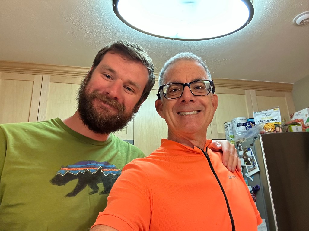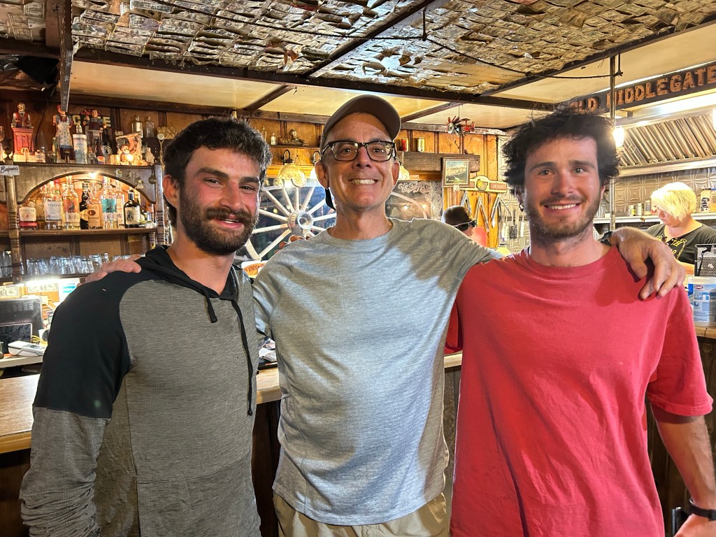 There was a spigot over by the trailer so I washed up a bit and got out of my sweaty biking gear – then I headed back over to the bar. And what a great surprise! Two more touring cyclists had ridden in and were having a beer on the porch – Max and Zach were college buddies who were each doing a separate tour, but had joined up to cycle together for awhile. They were on gravel bikes and were doing both on road and off road cycling. Really nice young guys – things were looking up as it is always fun to meet fellow cyclists!