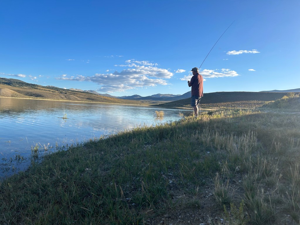 When I got to the campground there were several RV’s in place so I slowly rode around looking for an open spot. All of a sudden a tall man stepped out from behind his RV to greet me. Alfred and his wife Janette were camping one night on their way back to their home in Northern California. They had been to Colorado to attend their grandson’s wedding. They immediately invited me to have dinner with them and also shared their campsite with me so I would have a place to set my tent. Incredible! Alfred was walking down to the reservoir to try his luck with a fly rod, so I went with him and we took turns casting to the rising trout. Unfortunately we were skunked with only one hit and no catches between us, but it was a lot of fun as tons of trout were feeding on the surface.